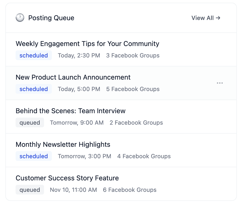 Effortlessly publish your posts across dozens or even hundreds of Facebook Groups at once—no manual posting required.